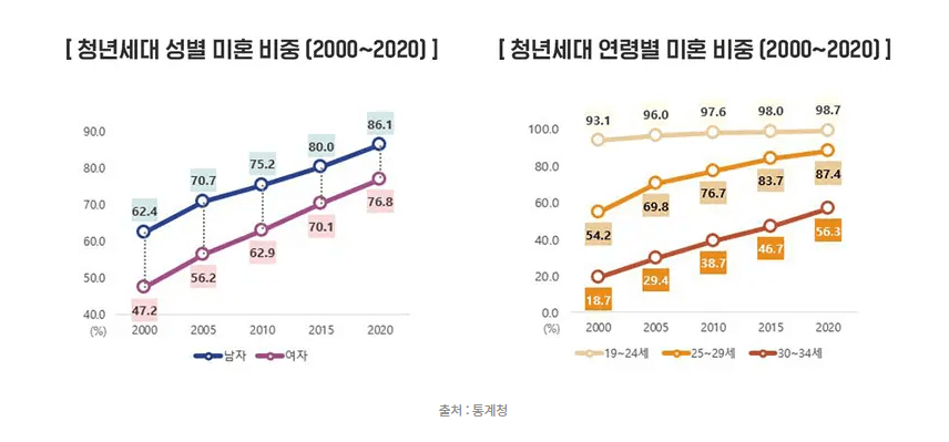 다른 통계 하나를 보여드리겠습니다. 19세에서 34세까지 청년 세대의 연령별 미혼 비중을 조사한 결과가 있습니다. 2000년부터 2020년까지의 자료를 보면, 19세에서 24세까지는 20년 동안 거의 변함없이 9할은 미혼인 상태입니다. 25세에서 29세까지는 미혼 비중이 높아졌으며, 54.2%에서 87.4%로 상승했습니다. 그러나 문제는 30세에서 34세까지입니다. 2000년에는 18.7%, 20%를 넘지 않았던 이 나이대의 미혼율이 20년 동안 56.3%로 증가했습니다. 결혼하지 않은 30대 초반 남녀의 수가 세 배나 늘었습니다. 결혼이 출산으로 이어지지 않는 상황이 있지만, 결혼이 이렇게 늦어진다면 출산도 더 늘어날 것으로 기대하기는 어렵습니다.