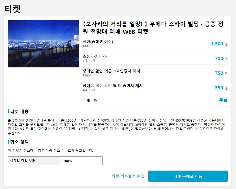 ※ 우메다 공중공원 티켓의 가격은 달라질 수 있으니 공식 웹사이트에서 확인하시고 예매를 진행하시기 바랍니다.