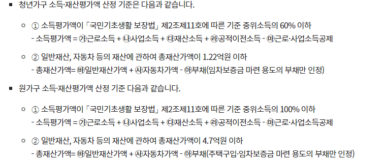 ▶ 19세~34세 독립거주 무주택 청년 중 청년가구 소득이 기준 중위소득 60% 이하이면서, 원가구 소득이 중위소득 100% 이하인 청년을 지원합니다.