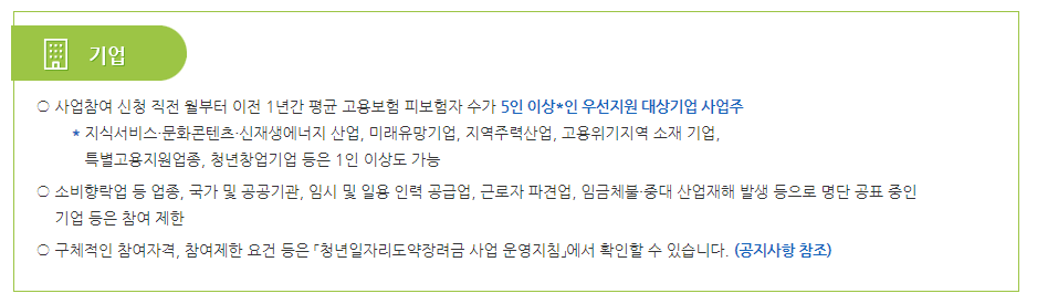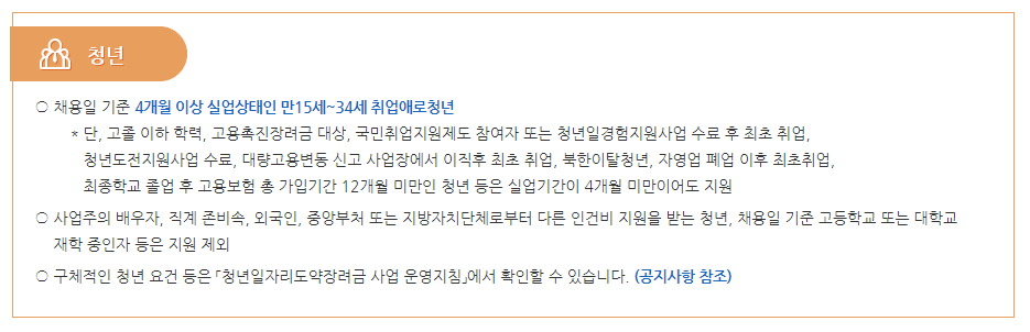 ※ 단, 채용일 기준 고졸이하 학력, 고용촉진장려금 대상, 국민취업지원제도 참여자, 청년도전지원사업 수료자, 자립준비