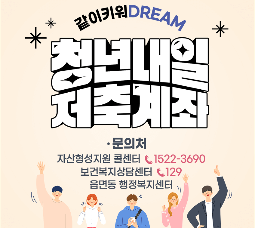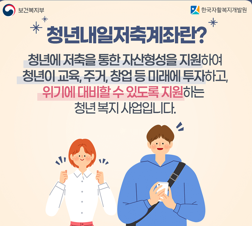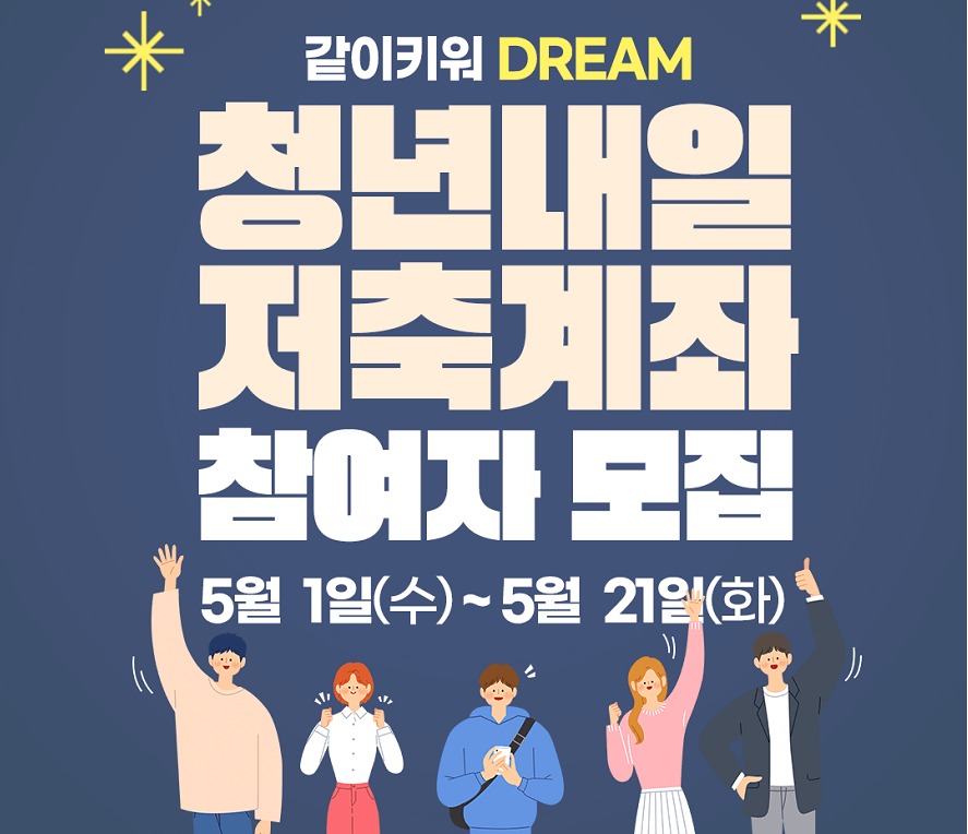 청년내일저축계좌는 본인적립금 10만원에 정부지원금 10만원~30만원을 더하여 지급하는 정부지원상품으로 지원대상은 기존 차상위 이하 청년에서 기준 중위 100% 이하 가구의 저소득 근로청년까지 확대되었습니다. 지원대상에 해당되는 분들은 지금 바로 신청해 보시기 바랍니다.